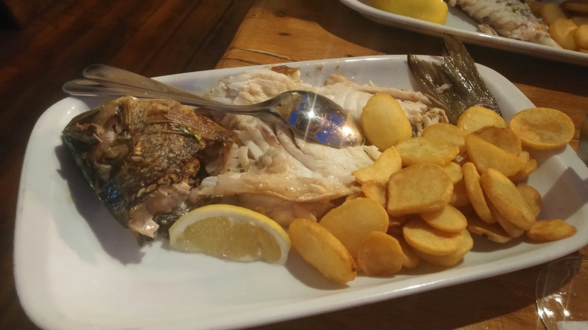 Sista kvällen åt vi fisk, egen vald och fileead vid bordet, jättegott. Gott lokalt vitt vin till detta.
