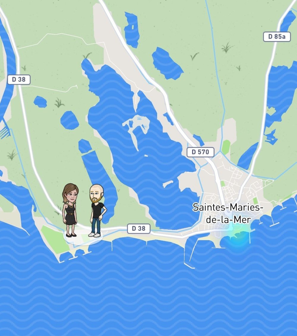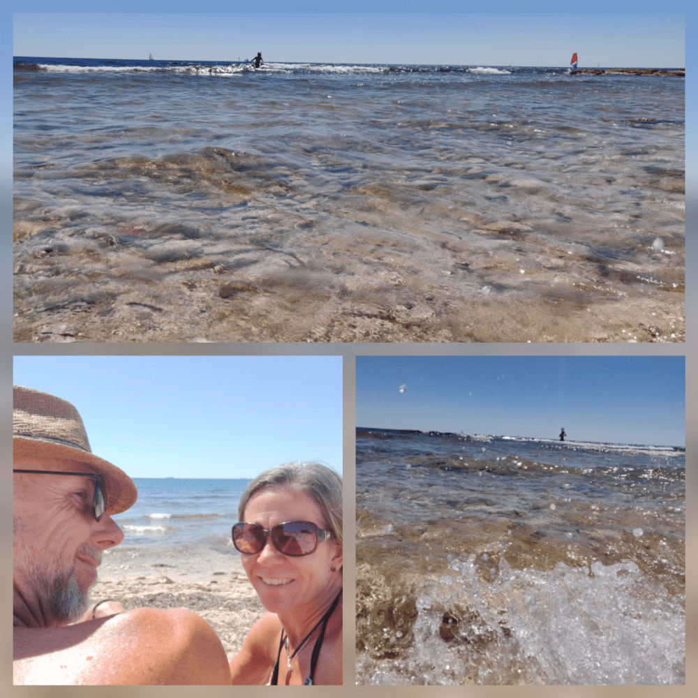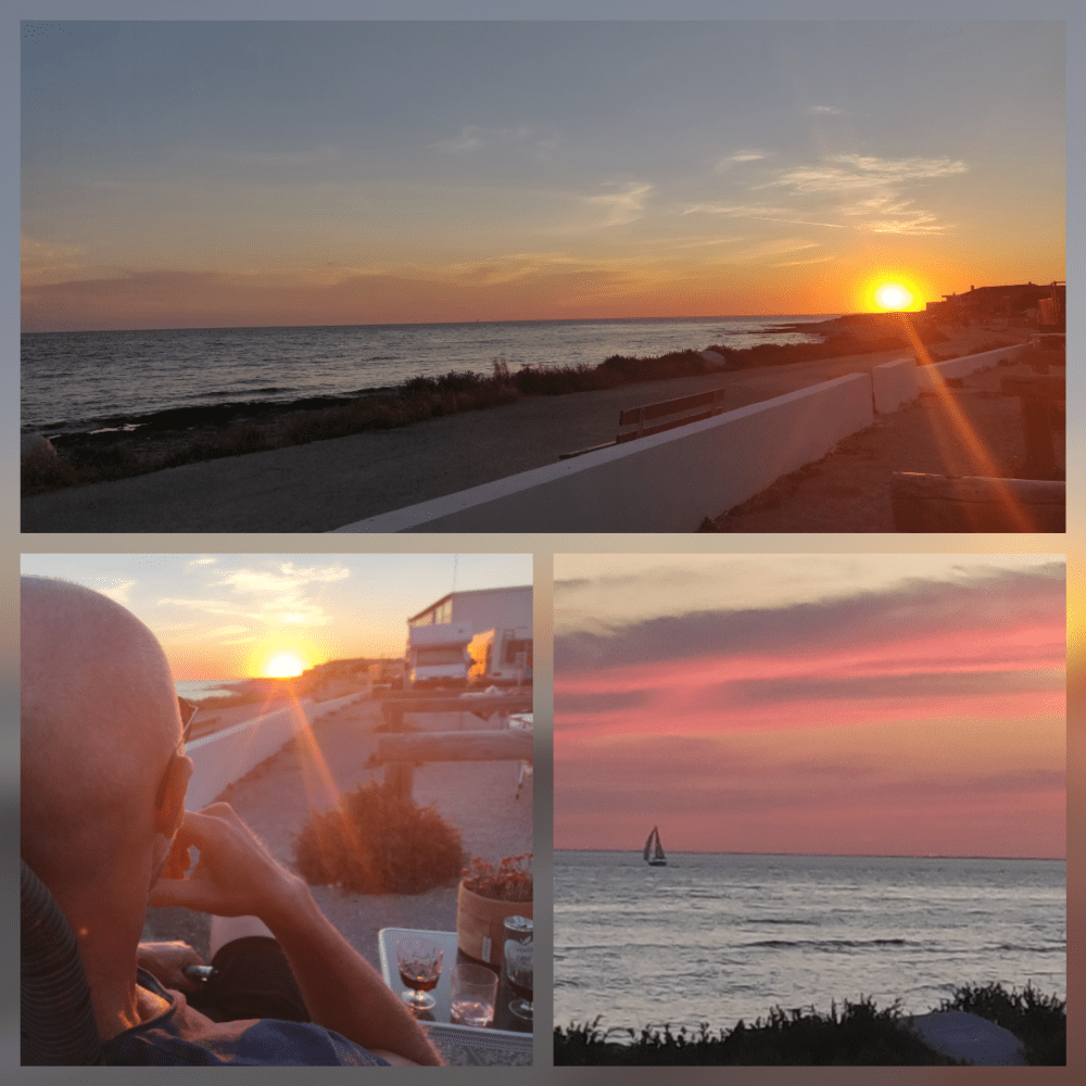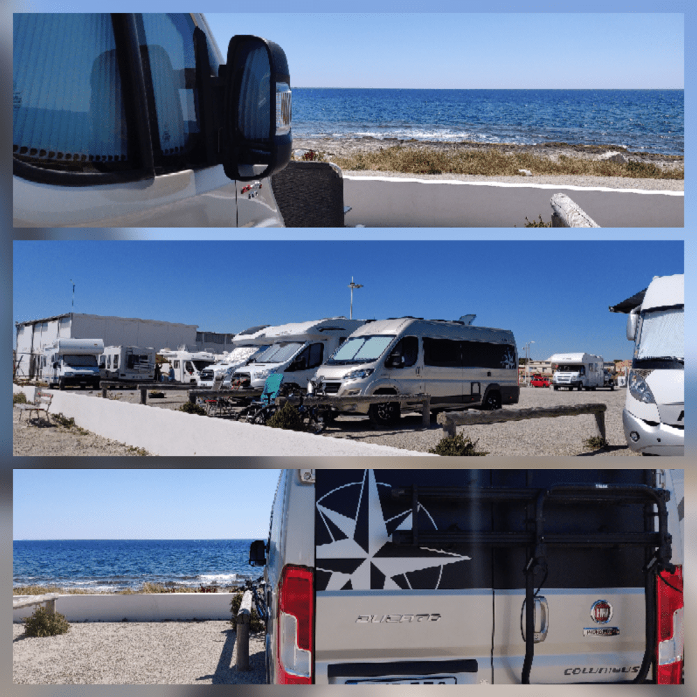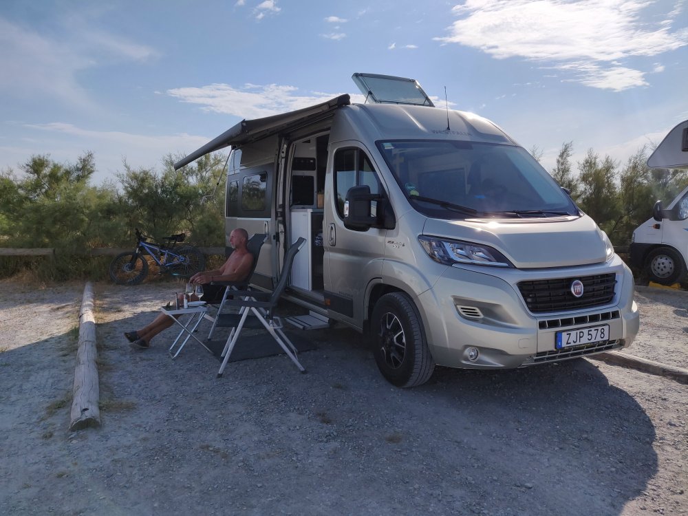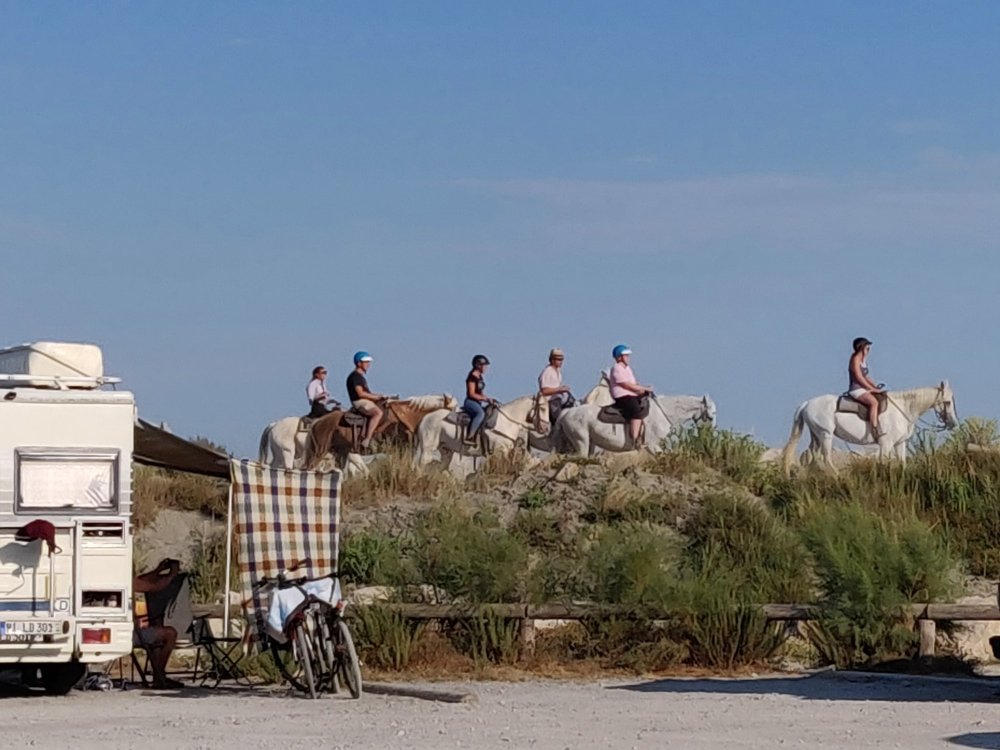 Efter dagen åkte vi till ställplatsen nära Saintes Maries de la Mer. Alltså vilka ställplatser det finns, ca 70 platser och icke fullt. På andra sidan vallen är havet och badet.