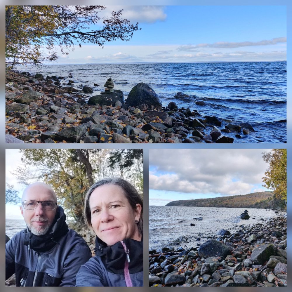 På lördagen gick vi gröna slingan, 7,5km med lite avstickare upp på utsiktsplatser. Så totalt blev det 10km upp och ner. Fika blev det vid Vätterns kant.