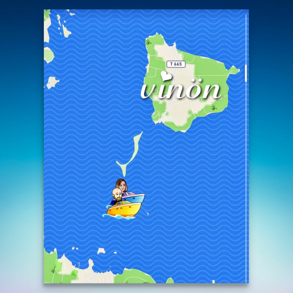 Vi åkte vidare till färjan som ska ta oss över till Vinön, ja visst låter det trevligt.🍷🍷