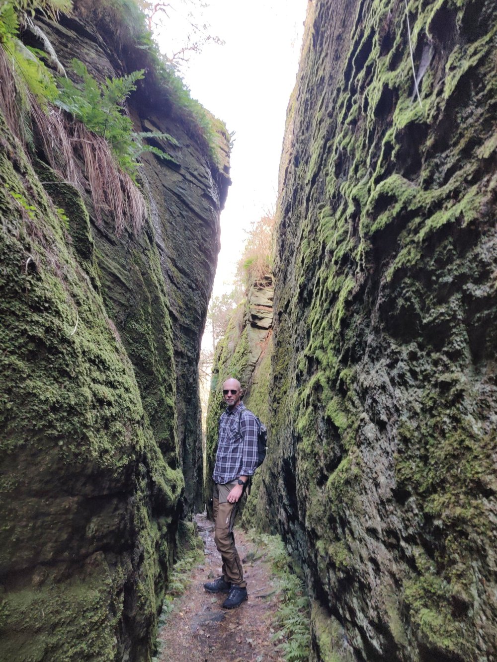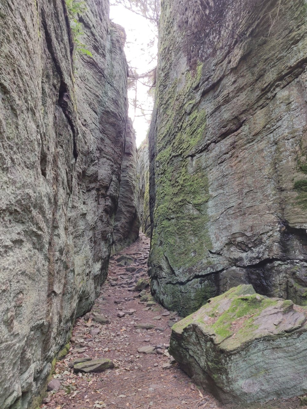 Häftig bergsklyfta mitt i skogen, ca 10 m djup och 100 m lång.