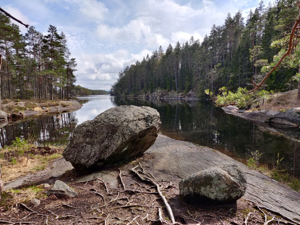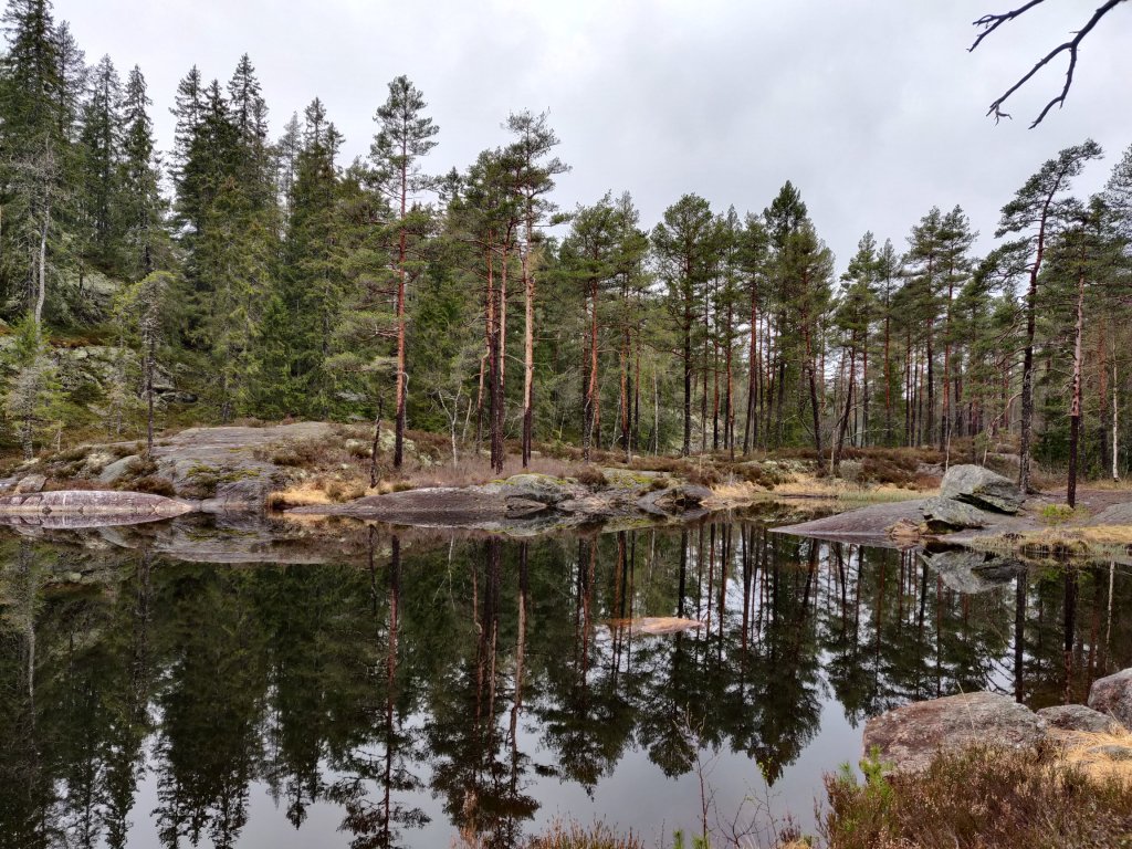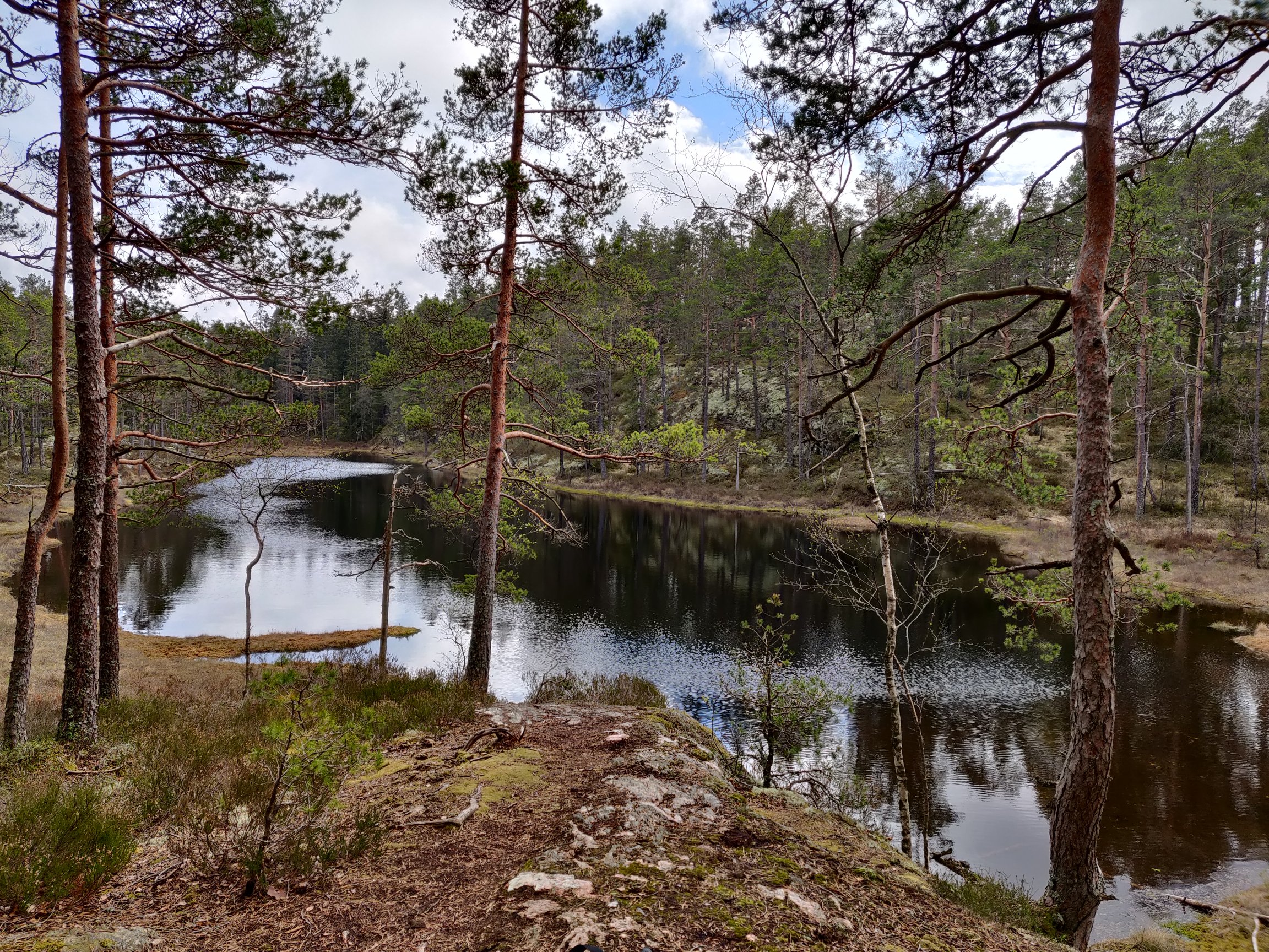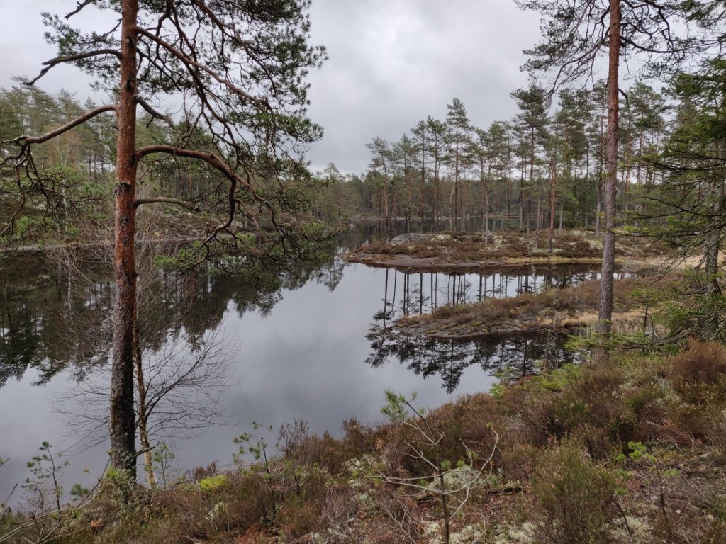 Härlig tallskog med mossa, rötter och massor av sjöar och tjärnar.