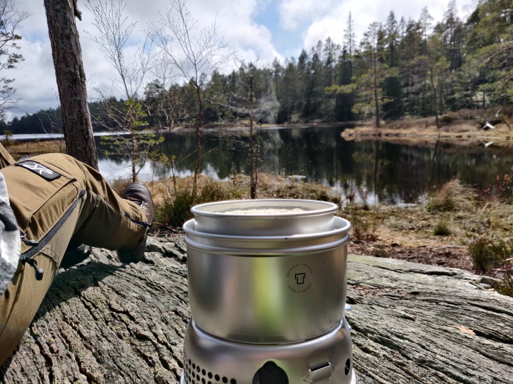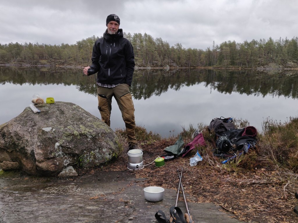 Naturligtvis hade vi med oss 11 kaffe men inte färdigt i termos utan vi valde att koka på trangiaköket. Vattnet tog vi från sjön och renade i inköpt vattenreningsfilter.