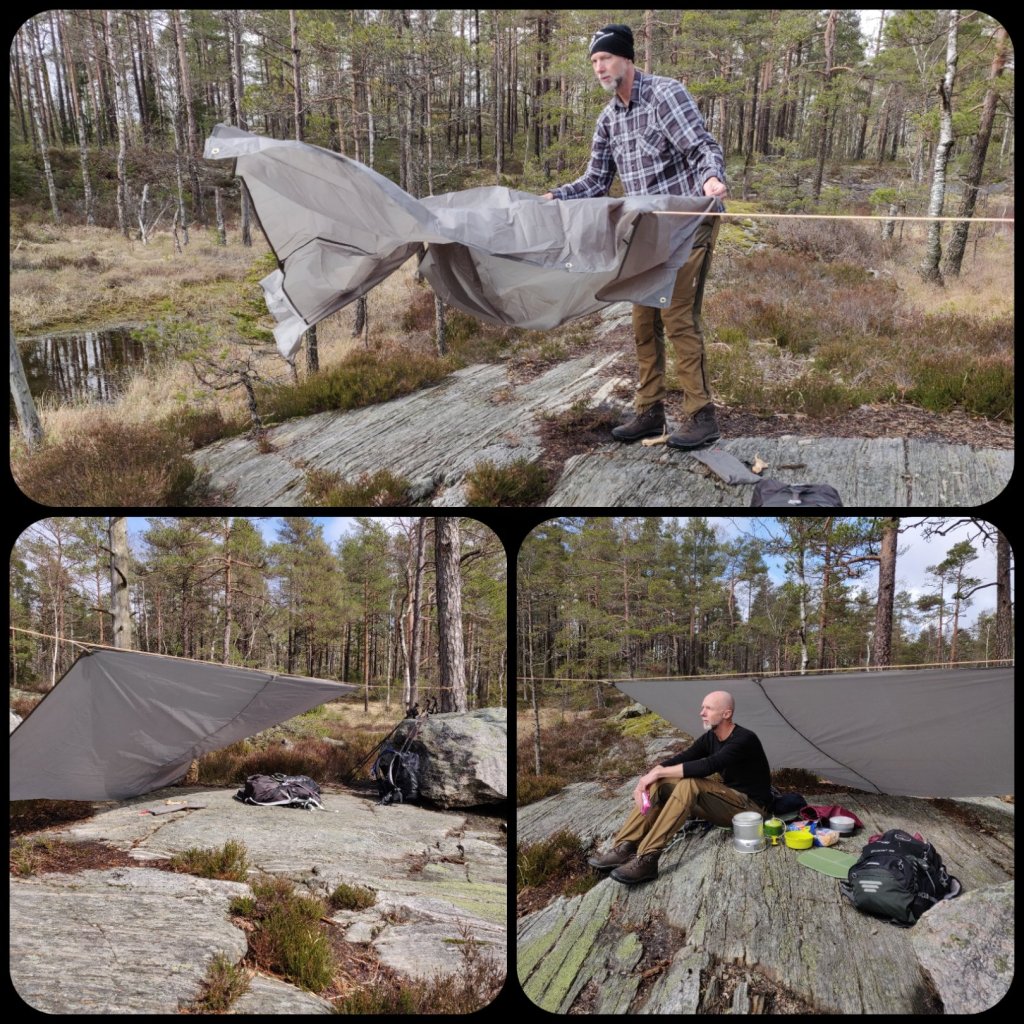 Peder testade att sätta upp vårt nya vindskydd, en tarp. Blev jättebra, den lilla vind som var slapp vi i ryggen och solen kom lagom fram och visade sig när vi åt.