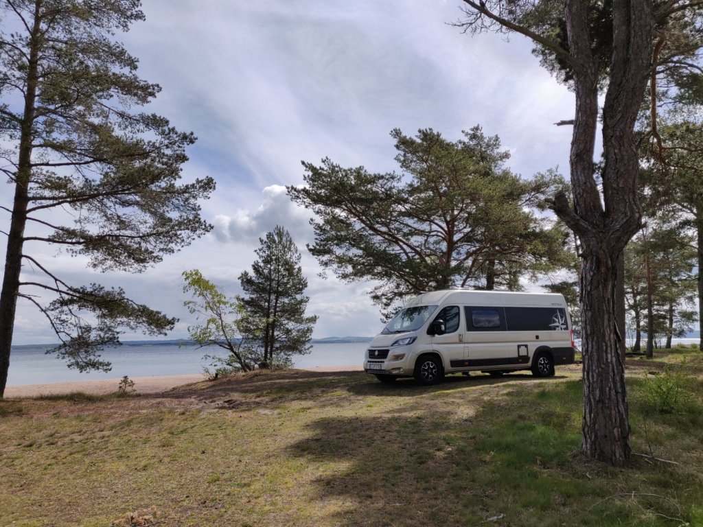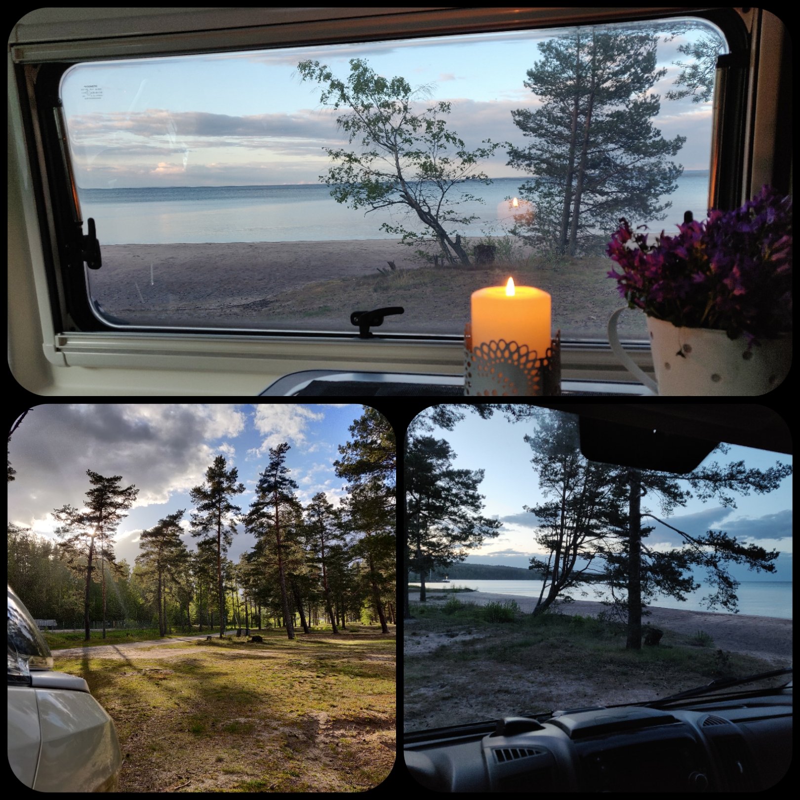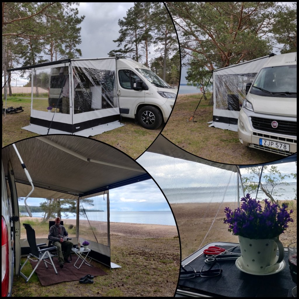 Här är så rofyllt utmed Vätterns strand. Vi tog en liten kort promenad och sedan en favorit i repris, eldning naturligtvis och bubbel är ju aldrig fel. Bordet på bilden har Peder gjort, ett kortare bord som vi kan ha när vi inte ska äta inne i bilen vilket ger oss lite mer utrymme.