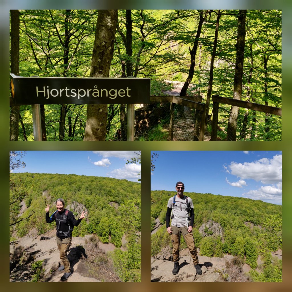 När vi kom upp på höjden fick vi fantastisk utsikt och hissnande stup. Vid Hjortsprånget kunde man gå ut på en smal landstunga. Här jagade man ut hjortar mot en säker död förr.