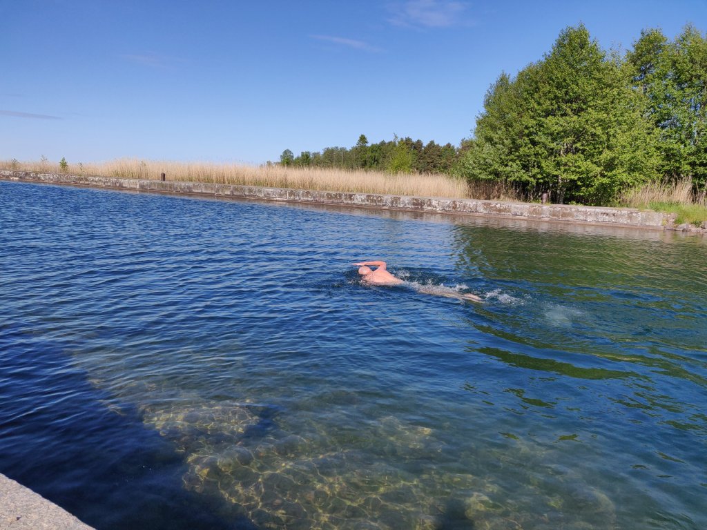 Vi anlände strax efter kl 18 och då fanns endast 3 platser kvar av 34. Våran plats som vi gillar var ledig så vi mådde gott och var nöjda.Efter en solig och skön kväll började vi lördagen med motion och efterföljande dopp i kanalen.