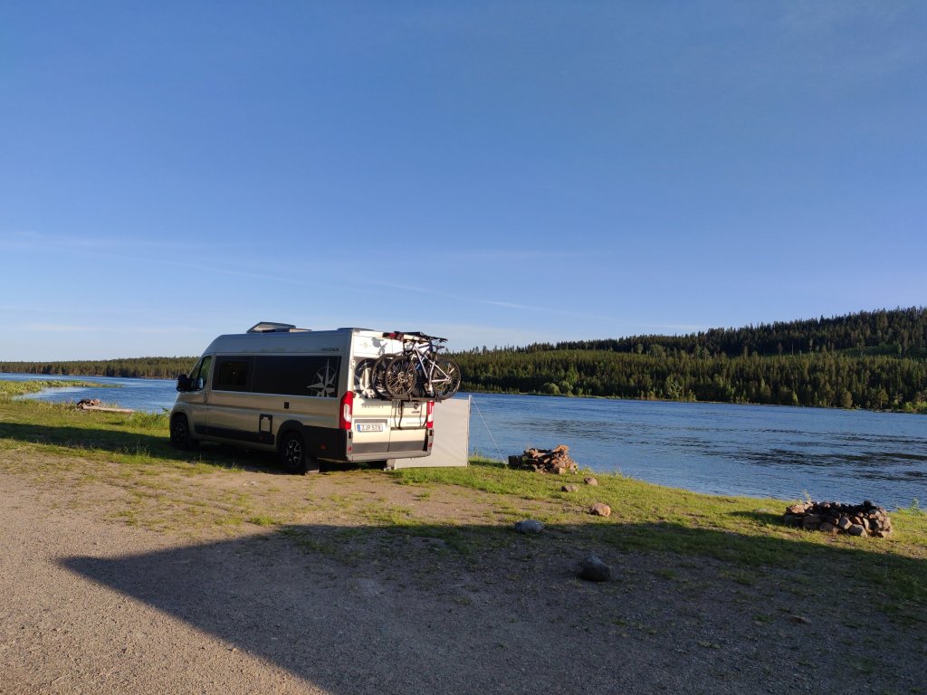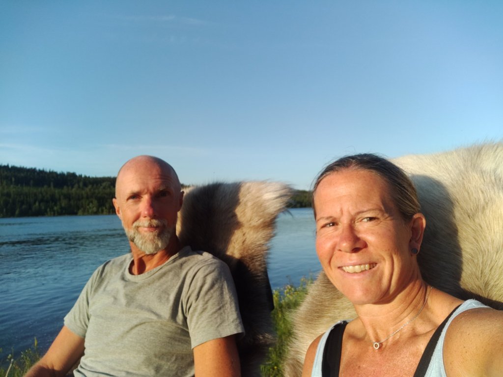 Nu njuter vi på våra renfällar i solen utmed älven ikväll.