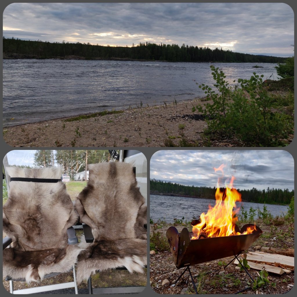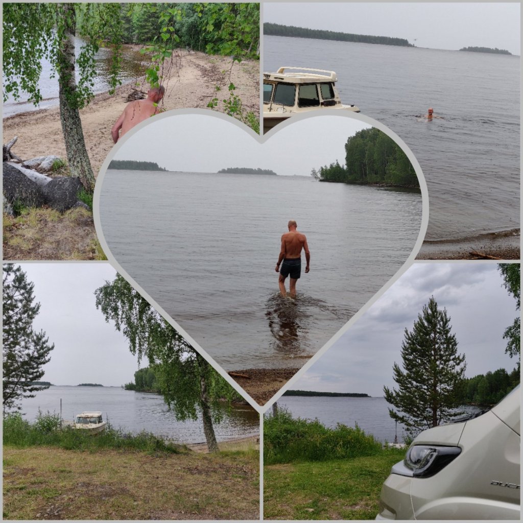En naturcamping vid havet nedanför Luleå. Grått ute men Peder skulle naturligtvis bada, jag satt med tröja och byxor på. Han hade ju satt upp vår vind/regn vägg så han var lite varm.