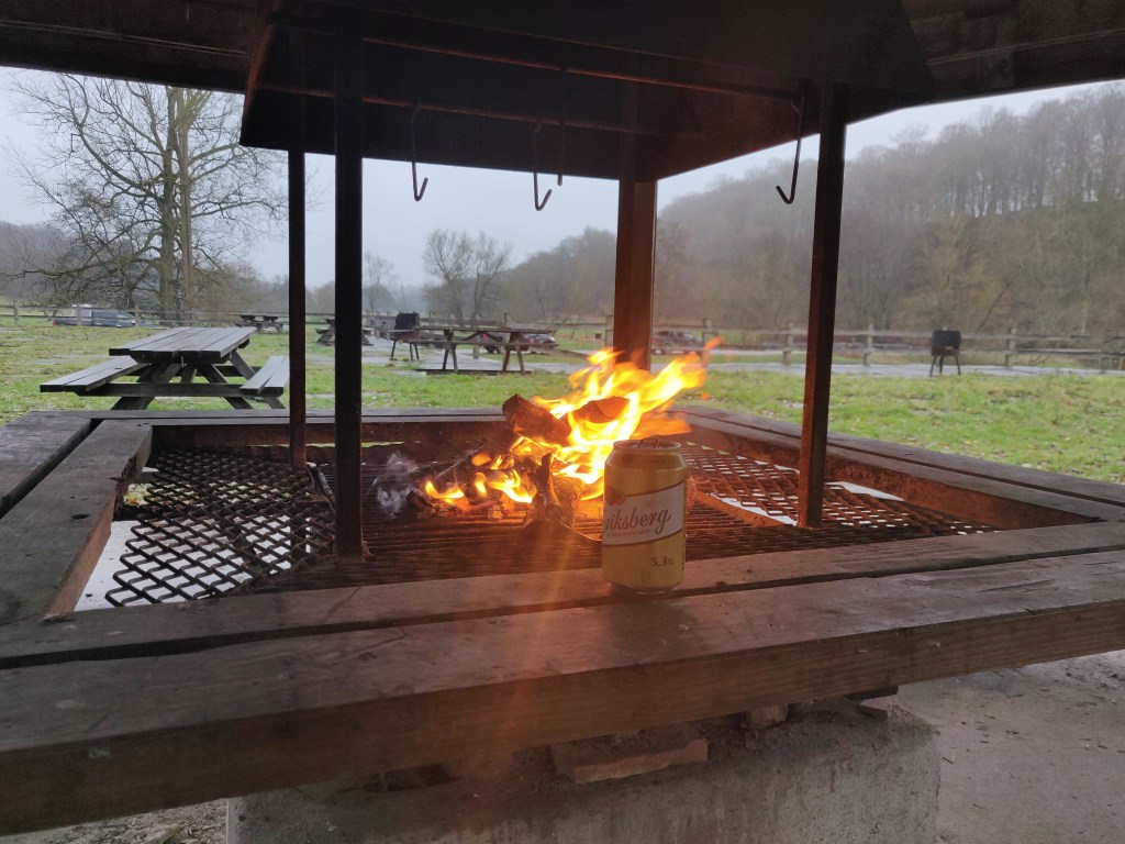 Efter en ännu tidigare morgon och ytterligare jobbmöte styrde kosan mot Tomelilla. Hört att det finns ett systembolag där. Ett par finöl och en liten flaska skumpa inhandlades. Eftersom att det blåste halv storm vid det här laget styrde vanen mot Fyledalen lite inåt landet. Tvingade ut mig att tända en brasa medans jag studerade jaktlagen som precis avslutat jakten i dalen. Måste varit flera lag då jag räknade till cirka 30 fyrhjulsdrivna pickupper som återsamlades efter dagen. Kvällen avslutades med skumpa, finöl och netflixmaraton.