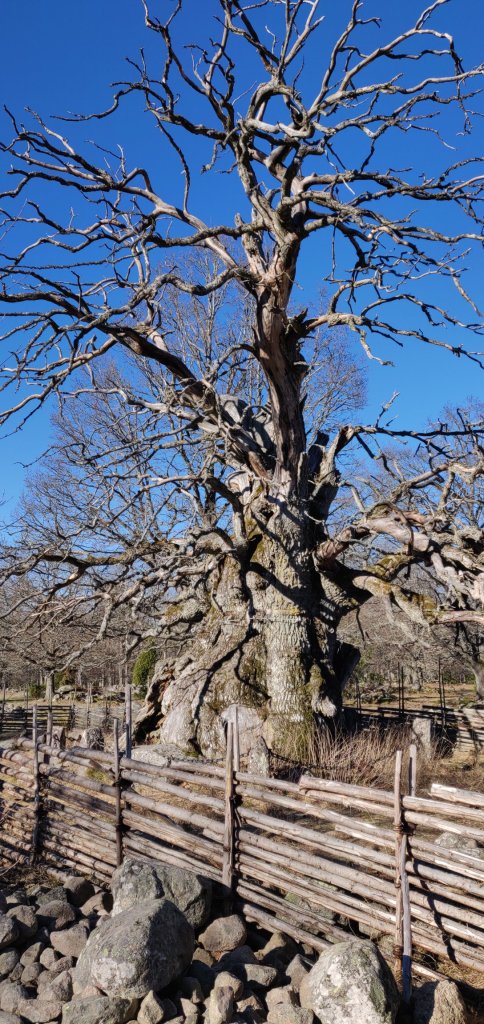 Jag tänkte att det kan väl inte vara så kul att se på men den var ganska maffig faktiskt. Cirka 13 meter i omkrets och så gammal att den börjat ramla ihop. Man håller ihop den med vajrar. Innan vi for vidare gick vi ut på ängarna bland alla andra ekar och stenrösen.