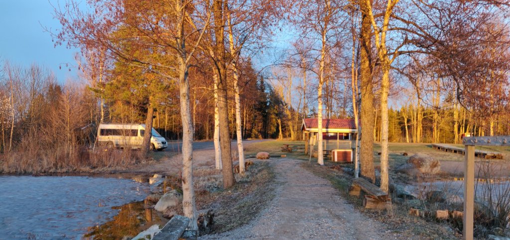 Vid sjön Nömmen fanns en badplats att stå vid, ett stugområde fanns bredvid men det var inte bebott ännu. En fantastisk solnedgång fick vi medans vi eldade.