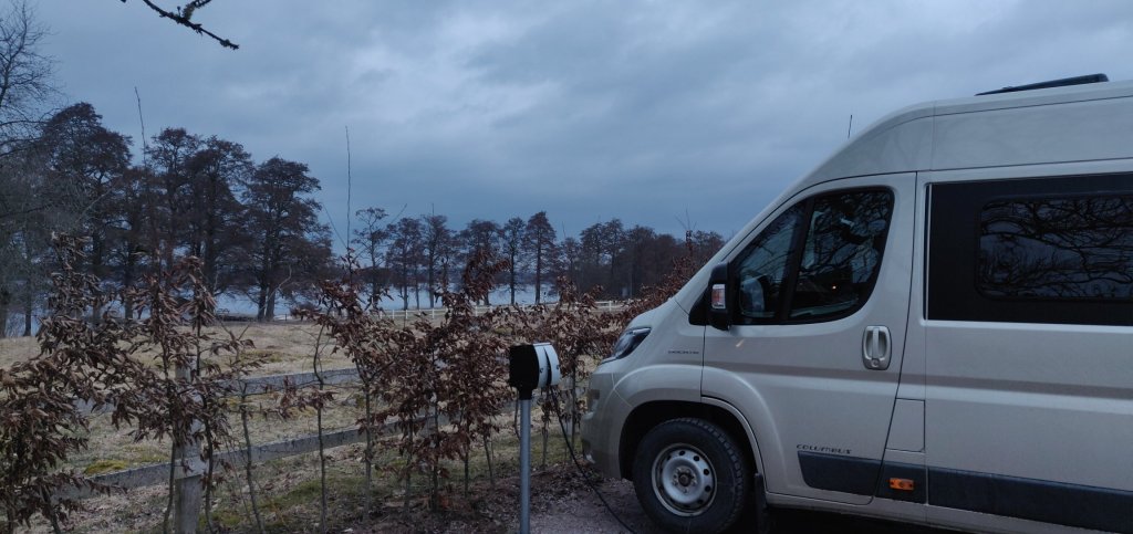 Vi hittade en ställplats söder om Ulricehamn, Hofsnäs herrgårds ställplats. 5 platser, med el för 100 kr och väldigt fint läge med promenadslinga på ca 5 km längs vattnet.