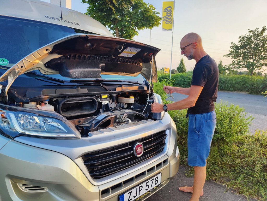 På färjan upptäckte Peder att ena lampan på bilen inte fungerade, som tur var var det lätt åtgärdat, ny lampa inhandlad på mack och YouTube visade hur man gjorde.,👍