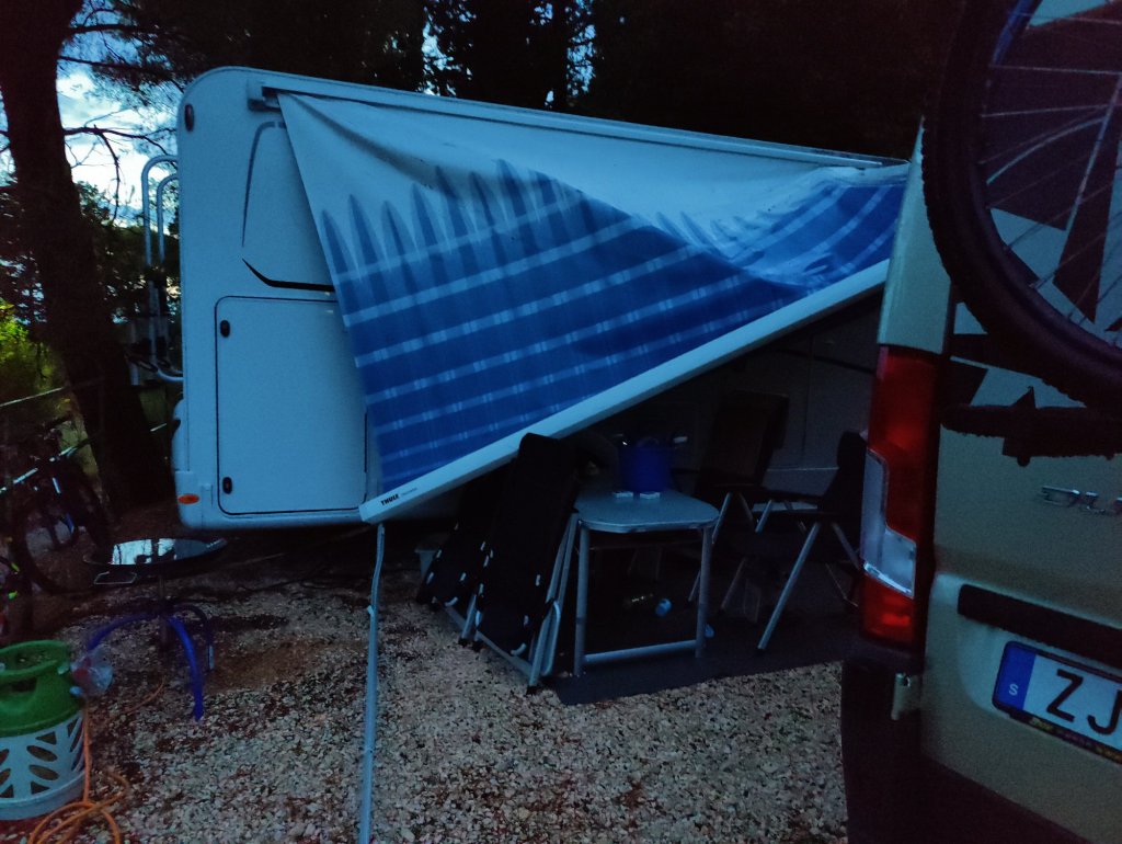 Senare pÄ kvÀllen packade vi in alla grejer för att ge oss av i ottan för att försöka undvika köer. Natten bjöd pÄ regn och ÄskovÀder, sÄ skönt att inte ha nÄgot ute. Grannens markis brakade ihop under ovÀdret, vi mÀrkte detta men dem verkade sova för dem kom inte ut.