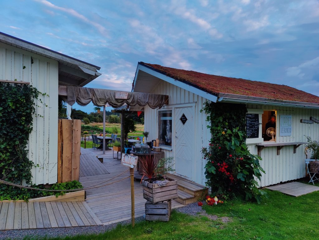 Vi kom inte fram förrän halv 8 och då var vi hungriga. 200 meter upp låg Jippies veranda.