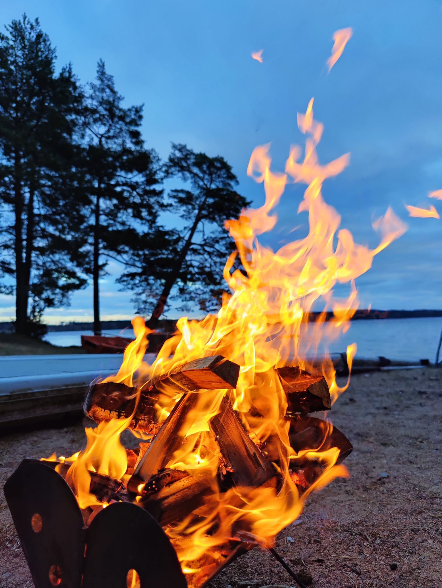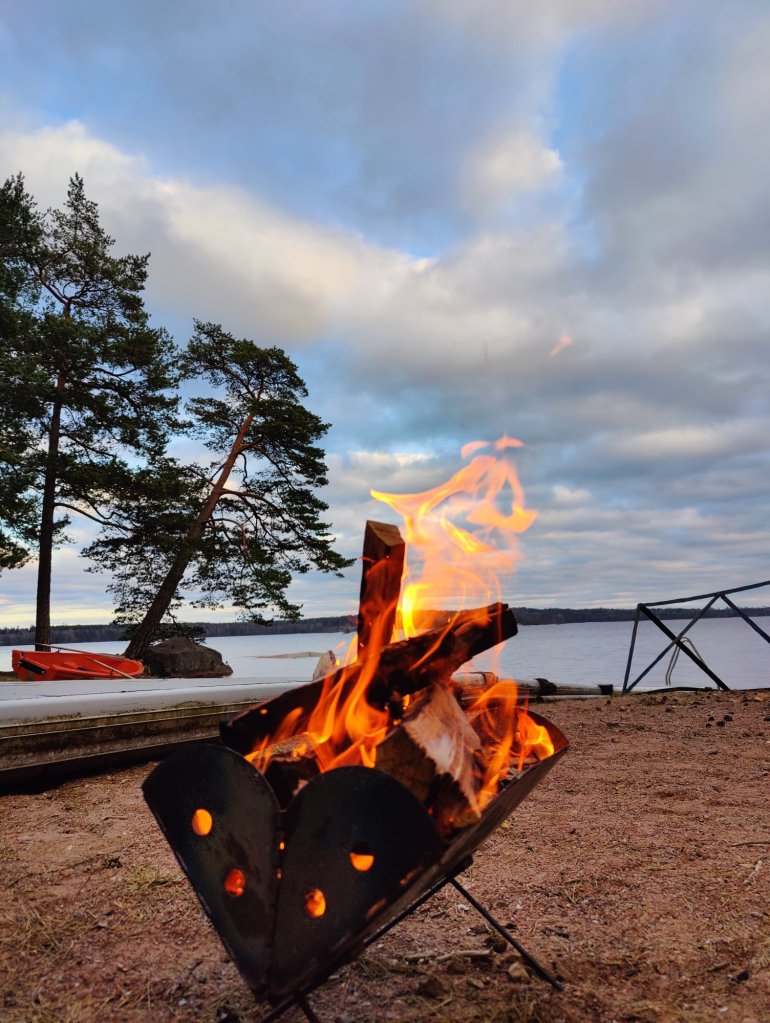 Medans pizzan gräddades I ugnen passade vi på att tända en liten brasa vid sjön.