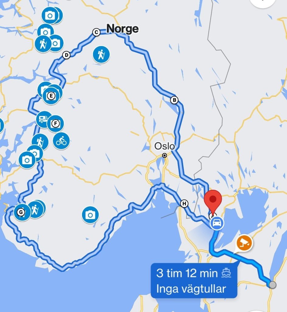 Hela resan (12 nätter) har varit helt fantastisk, det vi sett av Norge ger verkligen mersmak. Någon gång får det nog bli Lofoten. Är man i Norge så tycker vi att man bör förflytta sig för att se all vacker natur. Alla fjäll, berg, dalar och sjöar. Vädret har varit okej ändå med ganska mycket växlande moln och sol. Lägger med vår ungefärliga rutt.