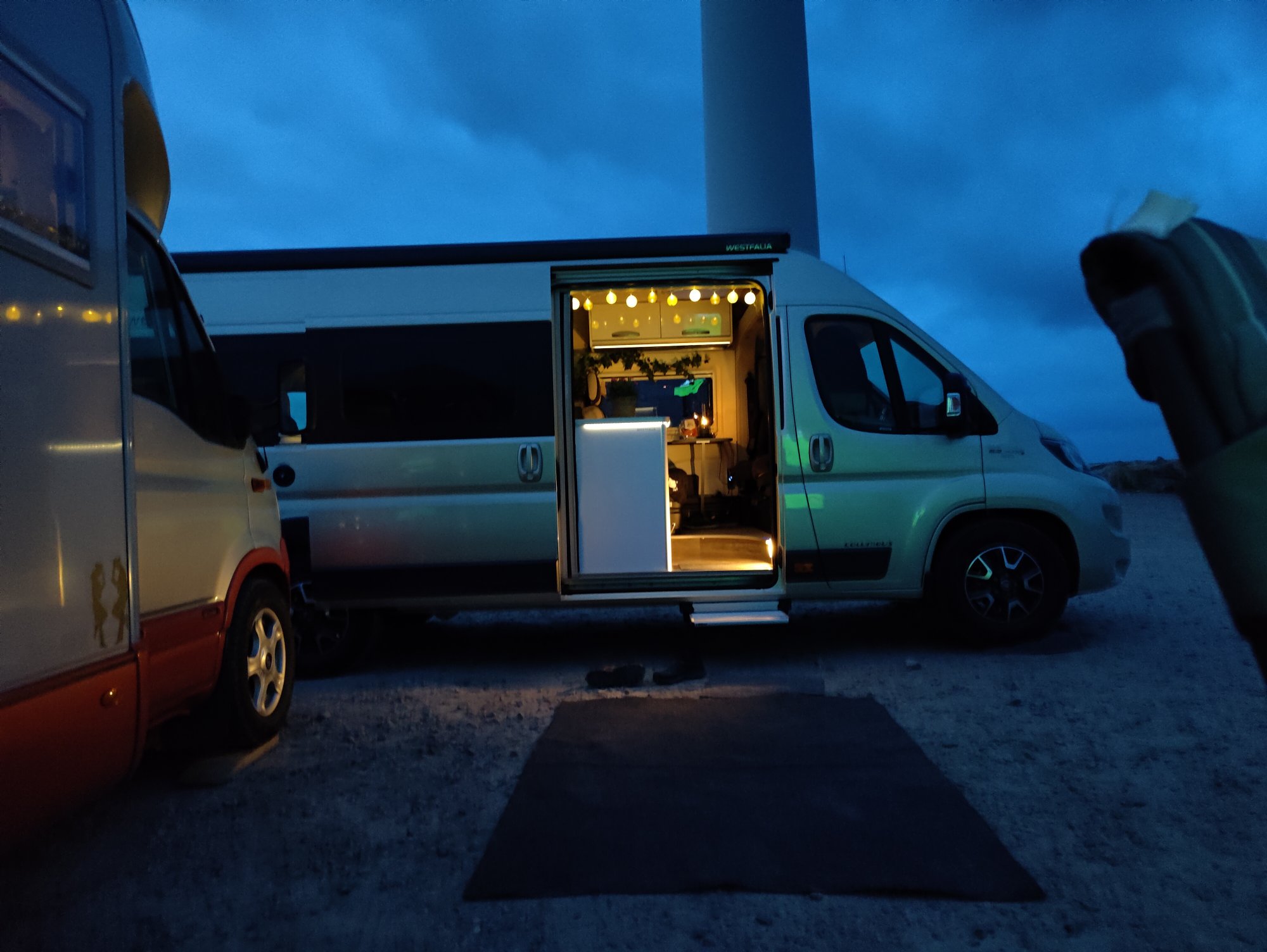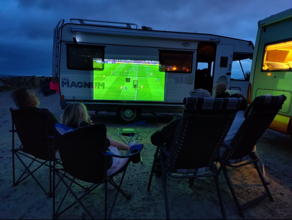 Framåt 22 tiden kom vårt sällskap tillbaka och Peder testade vår projektor ute mot en av husbilarna. Riktigt najs att sitta ute och kolla på storbildstv. I höst kan det nog bli lite filmtittande utomhus.
