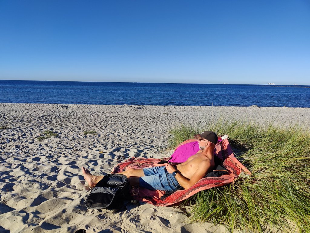 Efter att köpt lite öl och vin så vi har att börja med parkerade vi på en ställplats vid Grüner Brink strand. Varmt väder innebär att vi vill bada.