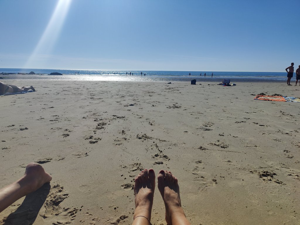 Här ligger vi på stranden/havsbotten. Tidvattnet har vi verkligen blivit hänförda av. När vi skulle ta andra doppet fick vi gå minst dubbelt så långt för att nå vattnet. Dagen efter stod vattnet ända vid trappan och knappt någon strand kvar, så märkligt.