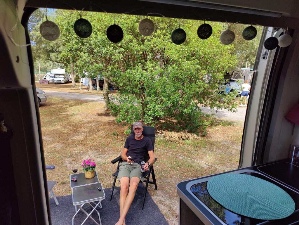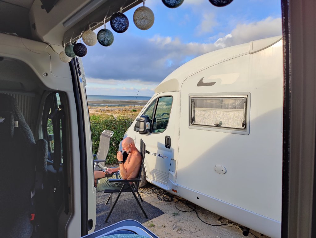Efter att parkerat och kommit iordning tog vi ett par timmars avkoppling på stranden med varsin bok. Sen blev det ost och charkbricka med bubbel.