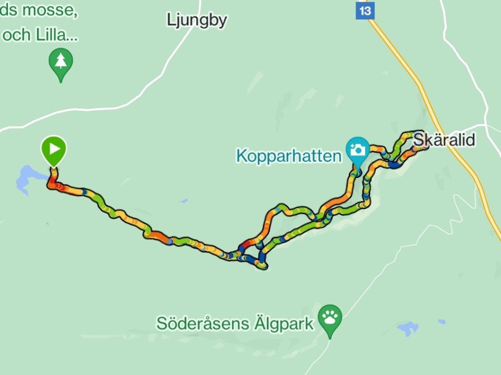 Innan vi åkte hem kände vi att vi ska nog gå en runda till i dessa vackra skogar och när vi ändå är i ett stort strövområde. Vi utgick från vår parkering och började ut mot mossen. En mosse innebär ju spänger och dom var svinhala och tyvärr inte nätade. Vi lyckades hålla oss på benen som tur var.