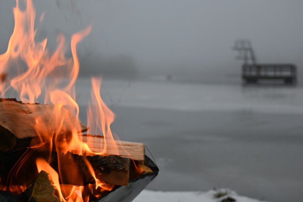Sjön låg klädd i is och ingen vak att bada i tyvärr, hade ju varit en utmaning annars. Istället eldade vi vid strandkanten.