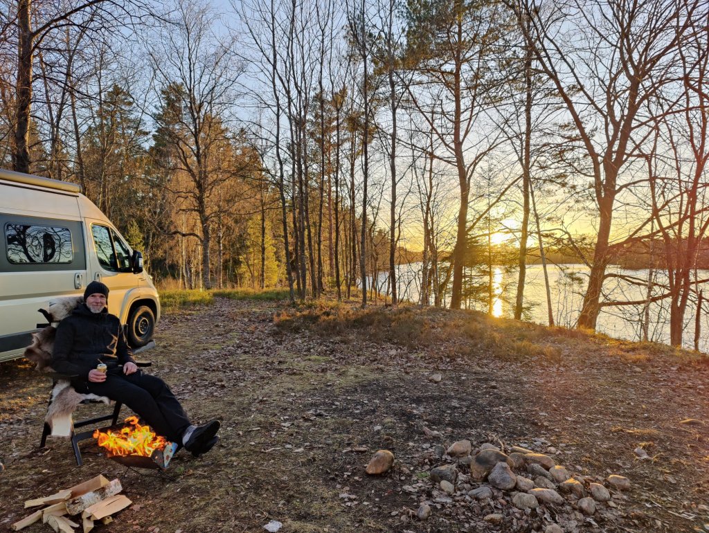 När solen började krypa nedanför trädtopparna blev det genast kyligare. Vi bestämde oss för att flytta bilen ner på udden och njuta av solnedgången.