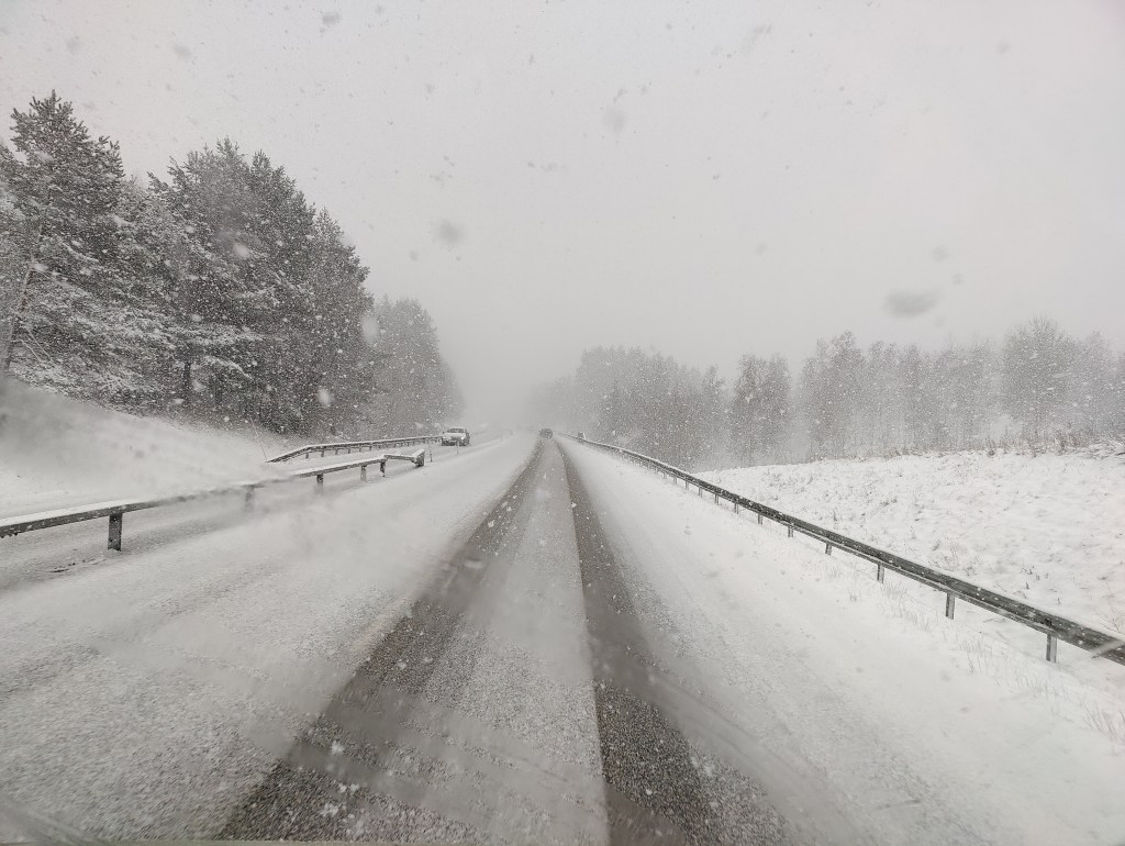 Sen sov vi gott. Natten blev en timme kortare i natt då det var dags att ställa om klockan för sommartid. Men vad vaknar vi till , jo snö. Och under resan hem blev det bara mer och mer snö.