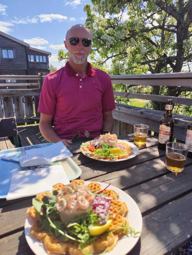 Vi blev sugna på våfflor när vi såg att det såldes. Men istället för kaffe och våffla blev det en lunch våffla med räkor.
