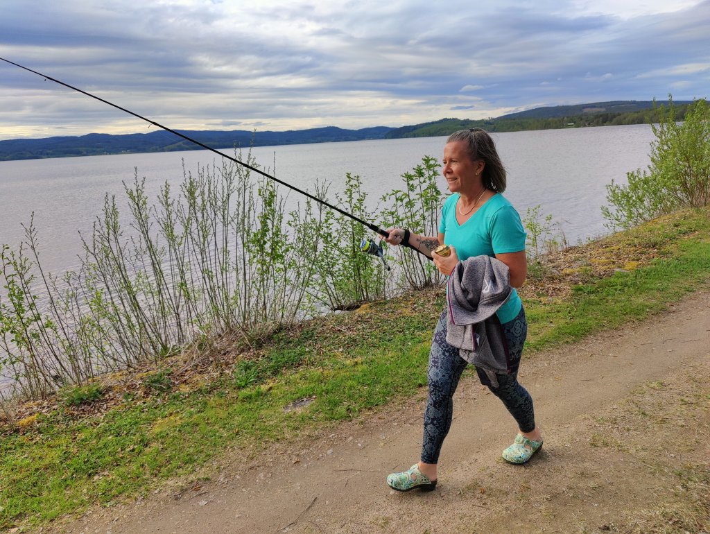 Tidigare idag stannade vi och inhandlade en del fiskeutrustning, bland annat ett spö till mig då jag ibland också vill fiska. Bara för att jag skulle få testa att kasta lite fixade Peder till spöt och gav mig lite goda råd.