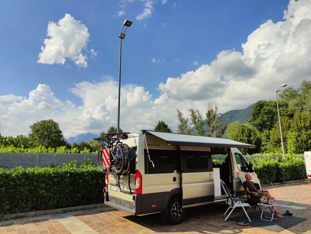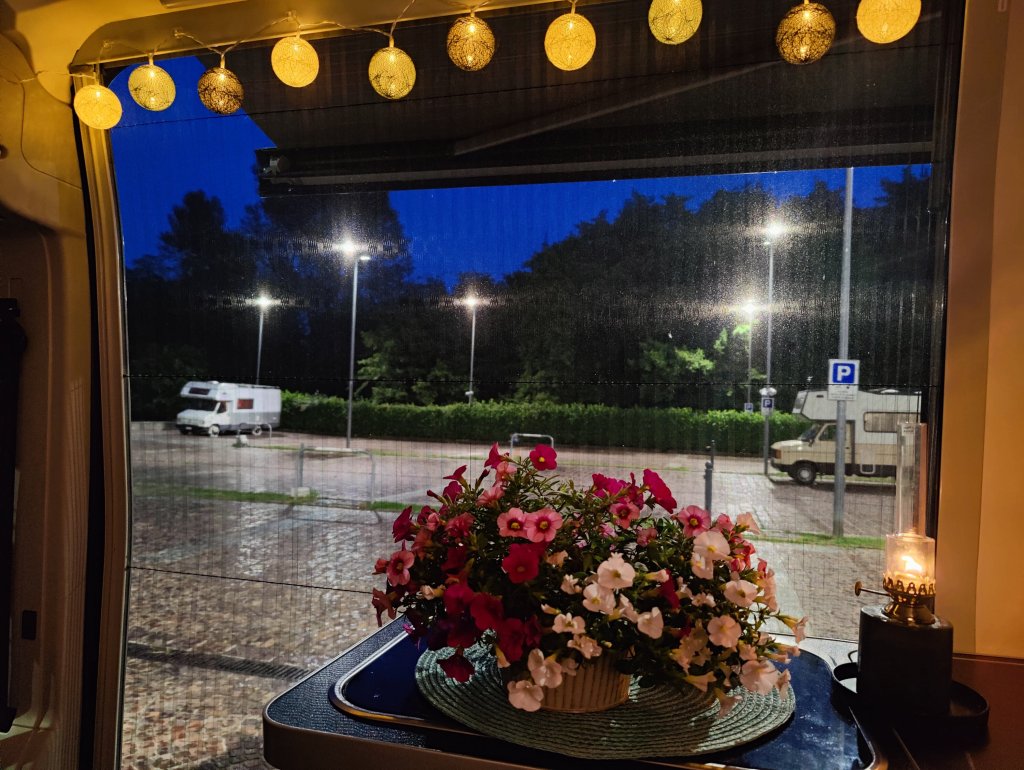 Inget wifi på vägen innebar att vi inte kunde söka på övernattningsmöjligheter. Väl inne i Italien och plinget i mobilen kom att vi var i roaming land igen gjorde att vi stannade till och börja leta plats för natten.