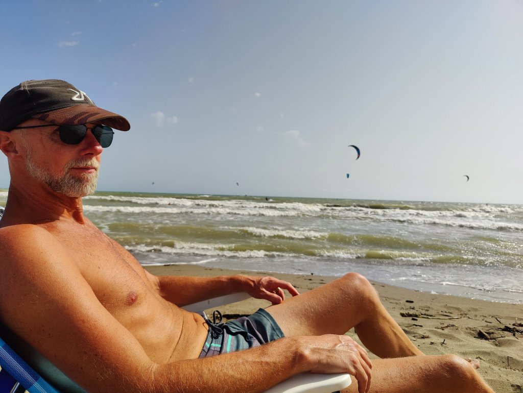 Visst ser det fint ut, men grumligt vatten pga vågorna och sandbotten. Vi blev sand blästrade där vi satt och jag blev mer och mer less på stället, sand överallt. Kanske pga vinden som det var så många kite surfare.