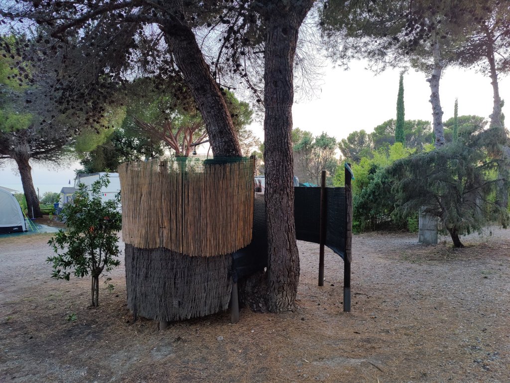 Utomhus dusch finns som funkar ypperligt för att duscha av sig på kvällen.