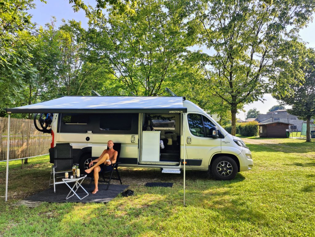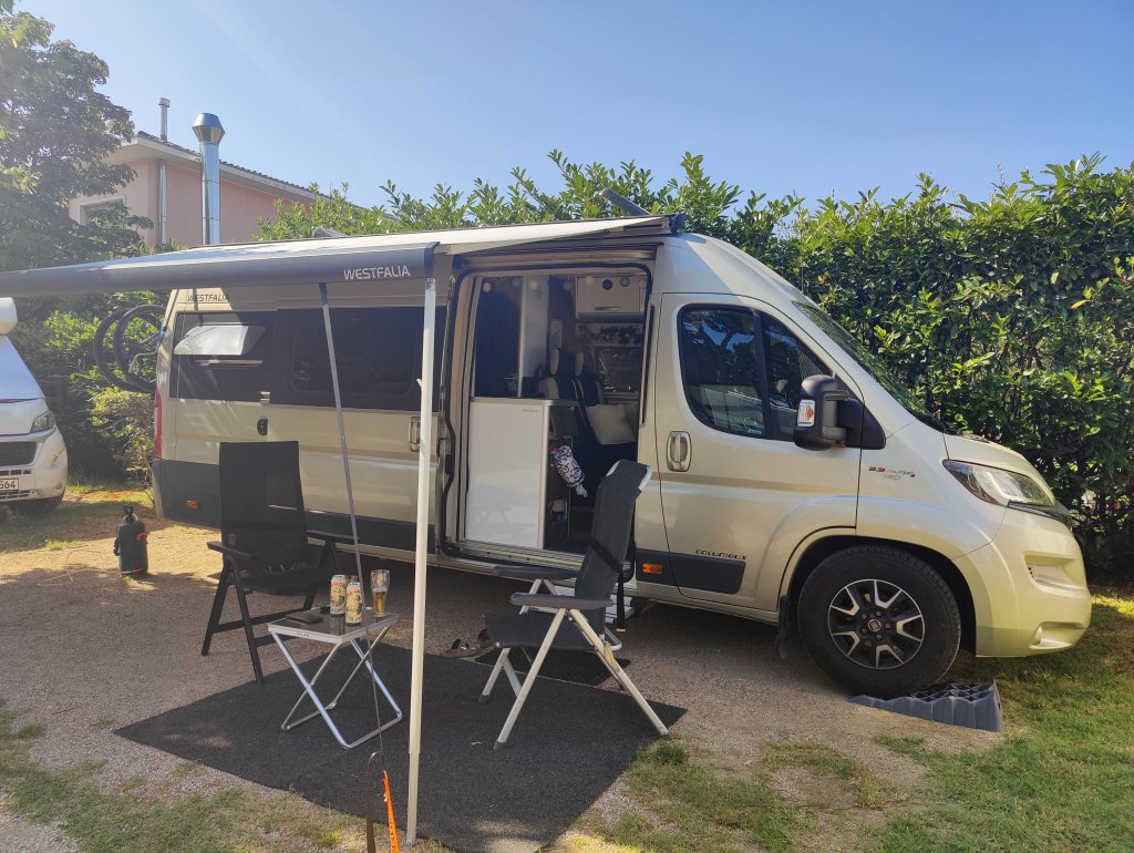 Det blev en ställplats där man fick knacka på en ruta hos Paula för att registrera sig och få en plats. Kort efter ankomst började det mulna på och åska och regn var ett faktum. Så skönt, får man säga det? Ja när man har varit i värme över 30 grader i 2 veckor. När vi sedan lagar lite kvällskäk börjar det hagla och inte vilka hagel som helst utan stora som pingisbollar.
