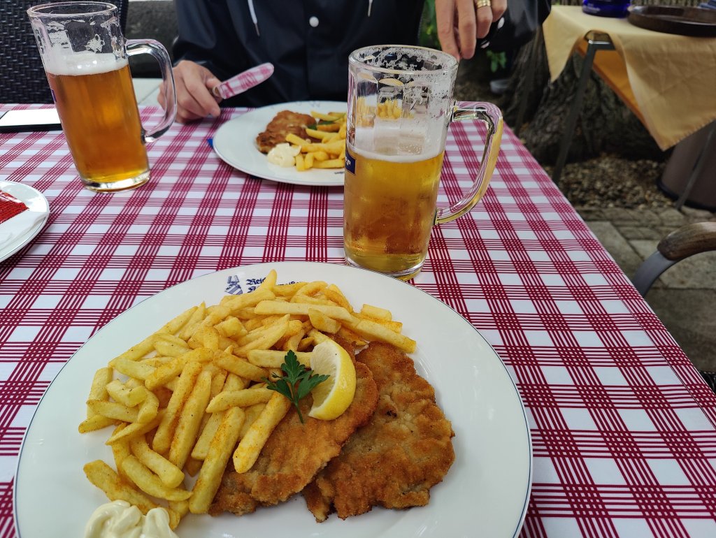 Men så började hungern sätt till och vi slog oss ner för att mätta magen med varsin schnitzel och en go öl .