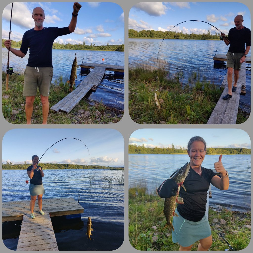 Jodå, vi fick upp varsin gädda. Så kul, min första firre. Nu släppte vi tillbaka dom för vi vill inte äta gädda med alla sina småben.