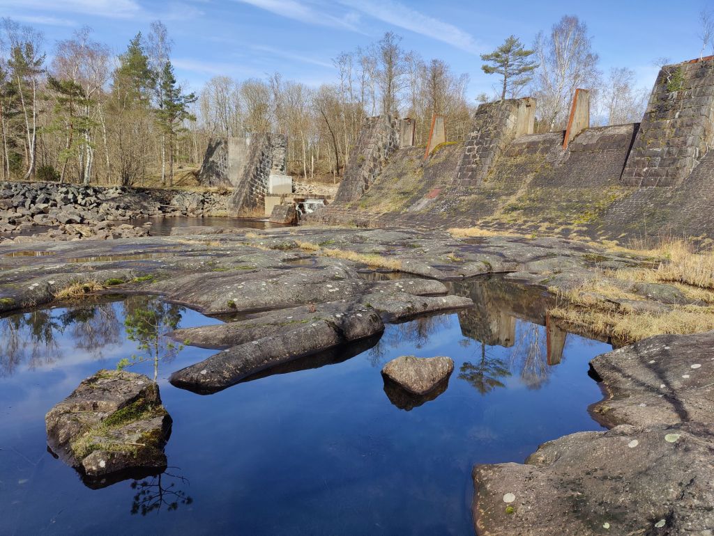 Påskafton och lite oklart vart vi ville. Vi siktade in oss på en plats vid en sjö, badplats, lugnt och skönt. Men först ett stopp vid Yngeredsfors ‘Döda Fallet’ – historiskt kraftverk.