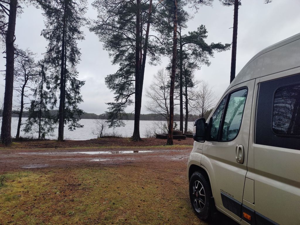 Grått och regnigt när vi kom fram och här stod redan tre husbilar. Det hade vi inte räknat med, men vi fick plats.