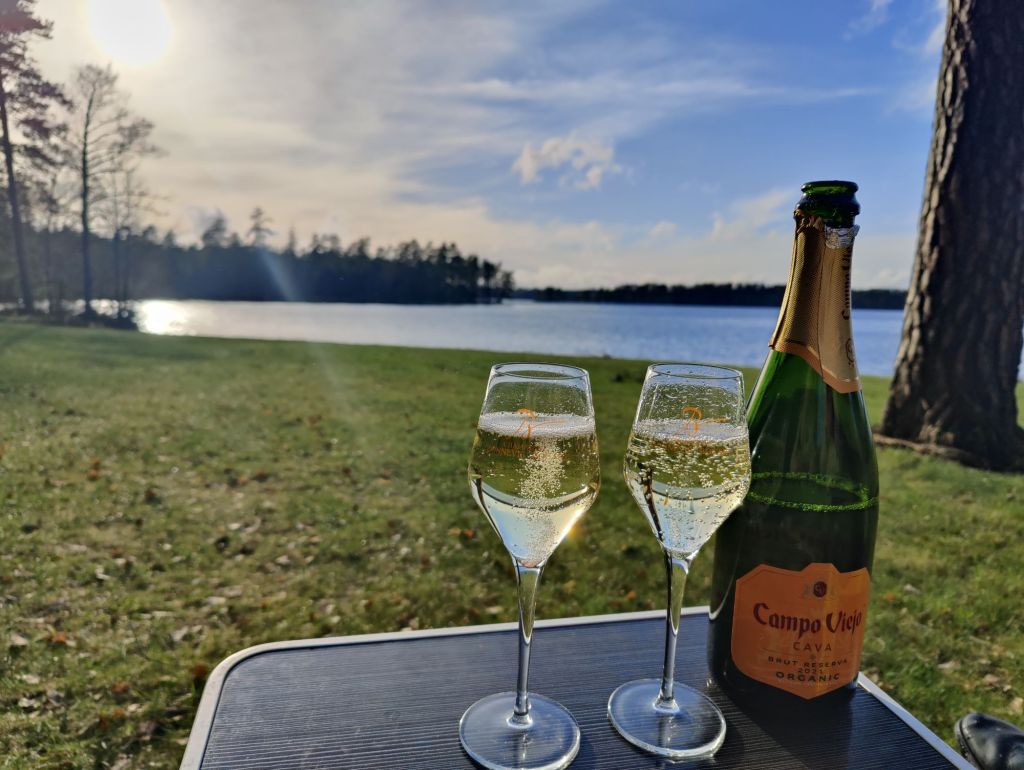 Efter ett par timmars värme var vi nöjda och packade ihop, även det gick väldigt snabbt. Nu hade solen börjat titta fram så vi svidande om och så blev det lite bubbel i solens sken.
