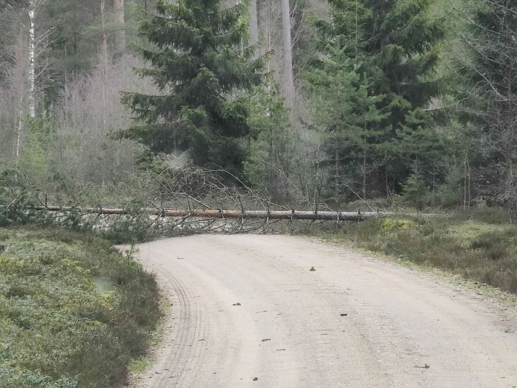 Ett träd över vägen, backa och hitta annan väg ut ur skogen. Tur att det fanns fler vägar att välja och vi kunde ta oss hem.