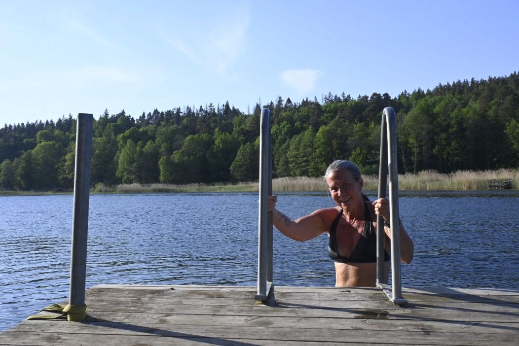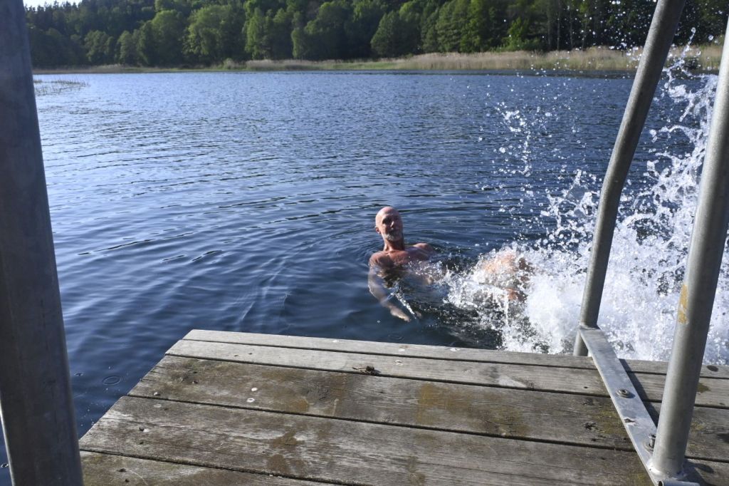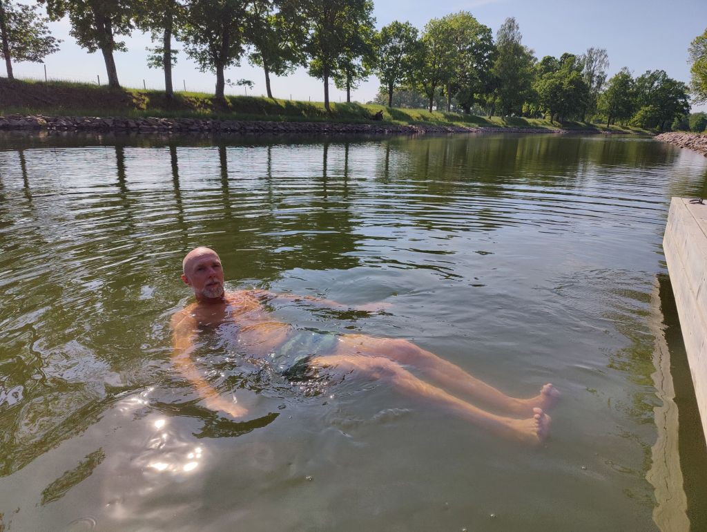 Innan vi grillade ville vi svalka av oss ytterligare en gång men nu gick vi till andra sidan, Motala ström. Lite klarare vatten där men också mer strömt.
