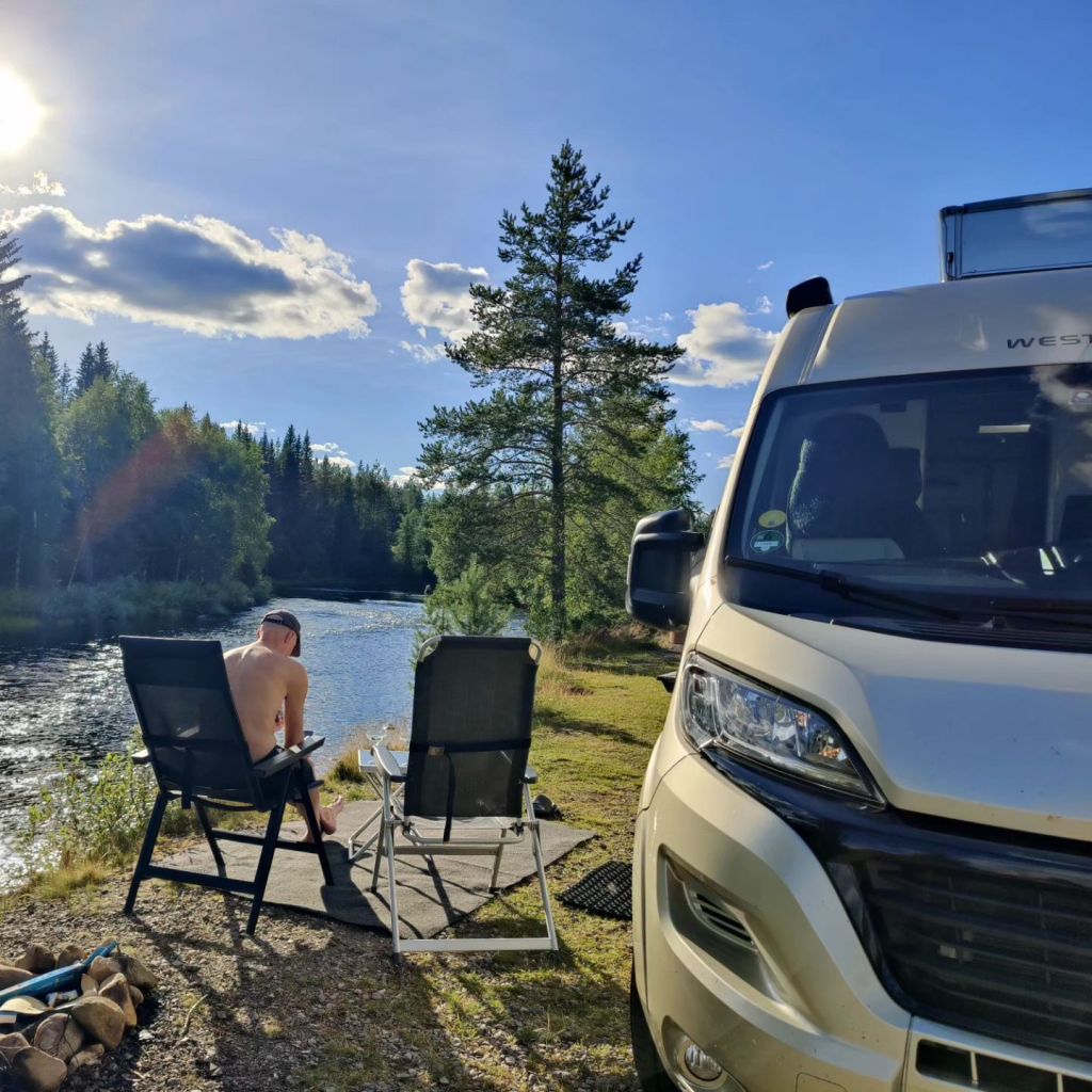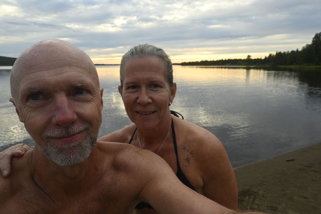 Efter en god natts sömn började jag (Annika) med ett fantastiskt morgon dopp. Så skönt. Frukost i solen innan vi fortsatte färden och landade på Mörkrets camping nära Fulufjällets nationalpark.