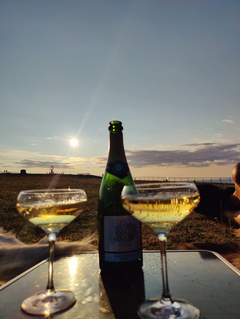 Väskan packades sedan med en flaska bubbel och vi tog med våra renfällar och hittade en bra plats att njuta av den ljumma kvällen.