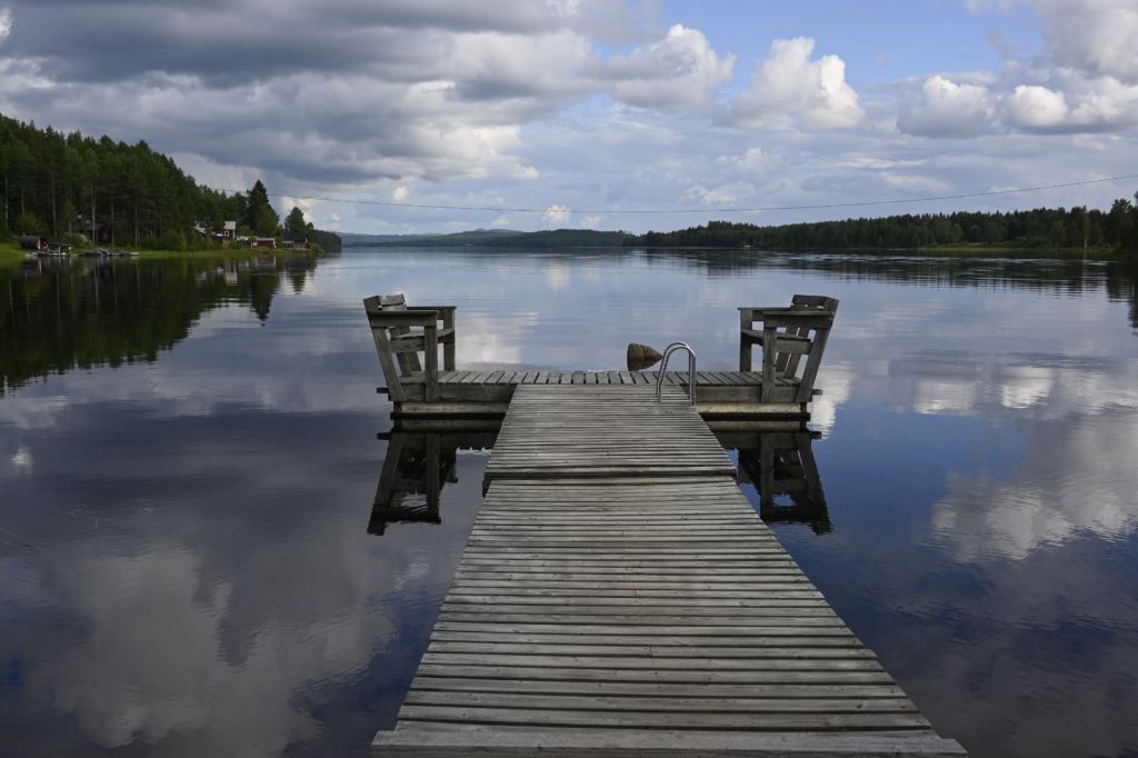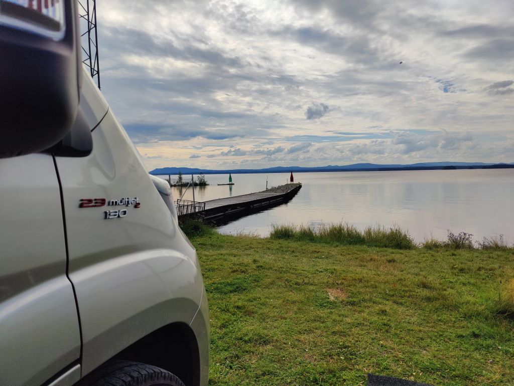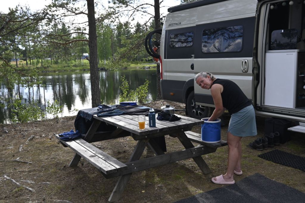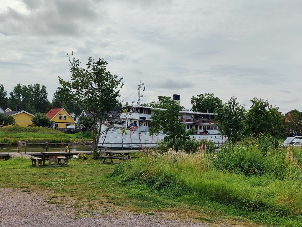 Lagom till vi kom tillbaka kom en kort regnskur, väl planerat. Vi rullade vidare söderut och åkte mot Nusnäs där vi har trivts bra förut. Vid ångbåtsbryggan var det fullt men strax bredvid fanns en ställplats vid blickpunkten, där fick vi en bra plats.