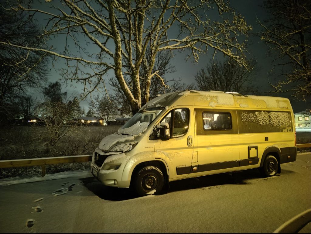 Vi hade tänkt övernatta på parkeringen och åka skidor nästa dag men då det inte dök upp någon plogbil och spåren inte var klara valde vi en ny destination. Vi åkte ner till Hofsnäs där vi fick en plats med el.