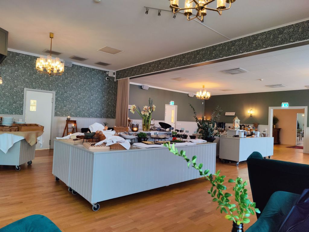 Dagen efter hade det kommit ännu mer snö och det var inte plogat på parkeringen. Innan vi kollade om vi skulle komma ut var det dags för frukost som också ingick i paketet.