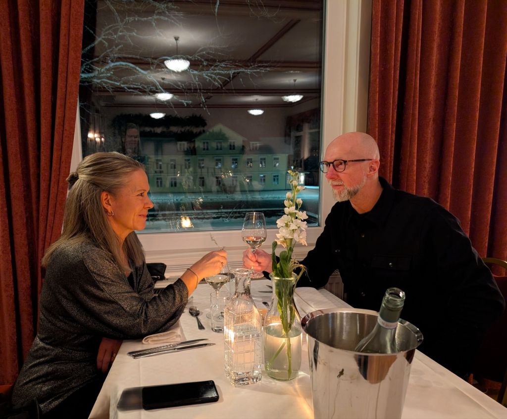 Huvudrätten blev Gös med skirat smör för oss båda däremot förrätt och desert valde vi lite olika. Men gott var det. Jag fick fel desert men sa inget, det uppmärksammade personalen själva efter ett tag och jag fick då även den jag beställde. Bra service.
