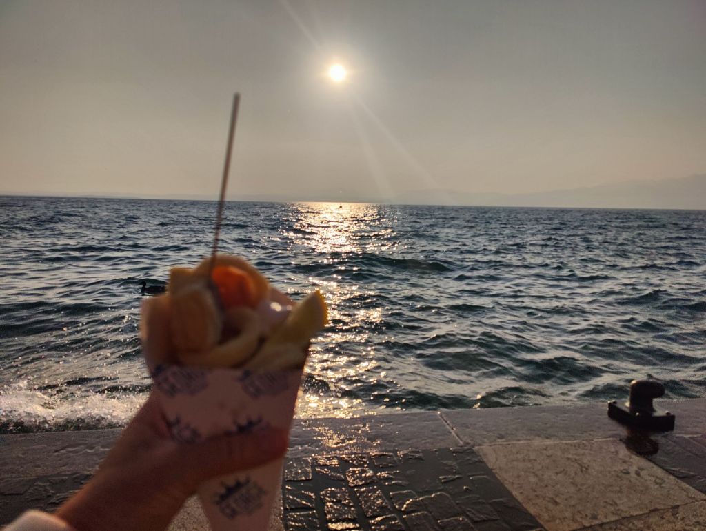 Ätit fisch and chips och samtidigt njutit av fin solnedgång från piren.